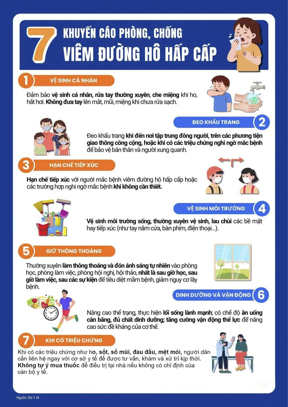 7. Khi có các triệu chứng như ho, sốt, sổ mũi, đau đầu, mệt mỏi, người dân cần liên hệ ngay với cơ sở y tế để được tư vấn, khám và xử trí kịp thời. Không tự ý mua thuốc, đặc biệt là thuốc kháng vi rút để điều trị tại nhà nếu không có chỉ định của cán bộ y tế.