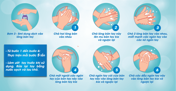 Rửa tay đúng thời điểm là một trong những cách đơn giản để tránh nhiễm bệnh và lây lan vi khuẩn. Chúng ta nên rửa tay bất cứ lúc nào thấy tay bẩn. Tuy nhiên, để loại bỏ được hoàn toàn virus, vi khuẩn bám trên tay, chúng ta cần rửa tay đúng cách theo 6 bước đơn giản: Làm ướt hai lòng bàn tay dưới vòi nước. Cho xà phòng vào lòng bàn tay và xoa đều; Chà lòng bàn tay này lên mu bàn tay và kẽ ngoài các ngón tay của bàn tay kia và ngược lại; Chà 2 lòng bàn tay vào nhau, miết mạnh các ngón tay và các kẽ ngón, móng tay trong vòng ít nhất 20 giây; Chà mặt ngoài các ngón tay của bàn tay này vào lòng bàn tay kia; Dùng bàn tay này xoay ngón cái của bàn tay kia và ngược lại; Tráng sạch tay dưới vòi nước. Lau khô tay bằng khăn sạch hoặc khăn sử dụng 1 lần.