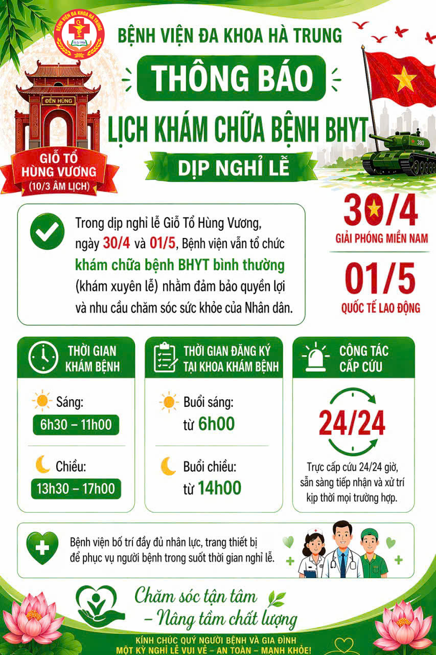 Trong dịp nghỉ lễ Giỗ Tổ Hùng Vương, ngày 30/4 và 01/5, Bệnh viện vẫn tổ chức khám chữa bệnh BẢO HIỂM Y TẾ BÌNH THƯỜNG (khám xuyên lễ) nhằm đảm bảo quyền lợi và nhu cầu chăm sóc sức khỏe của Nhân dân.
